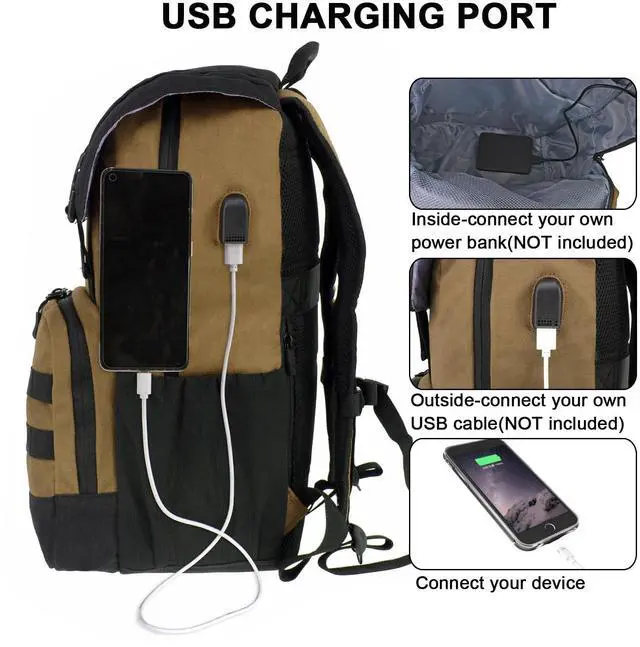 • USB Charging Port: The laptop backpack features an external USB charging port, allowing you to connect a power bank (not included) and charge your electronic devices conveniently