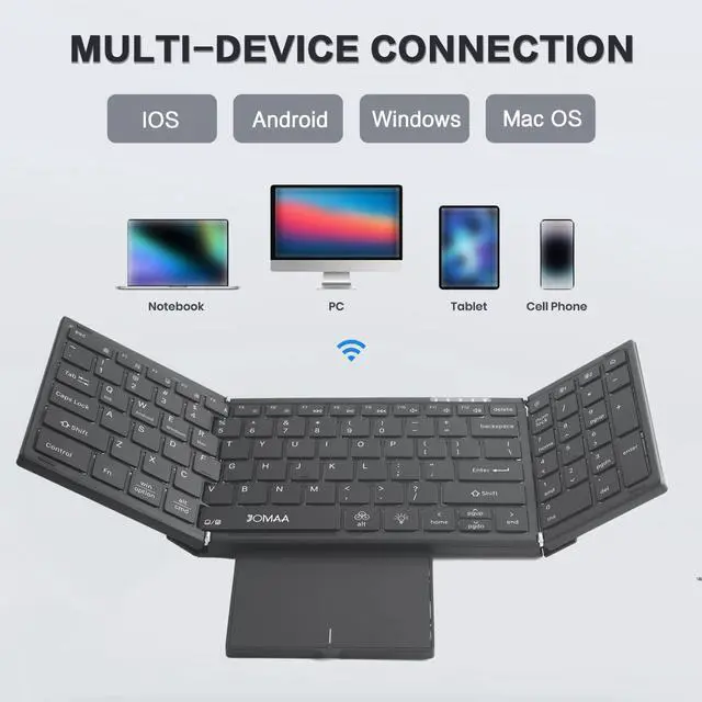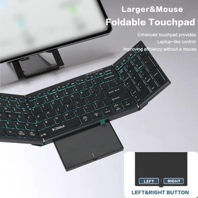Multi-Device Bluetooth & 2.4G Connectivity Easily switch between 2 Bluetooth channels or use the included USB receiver for seamless compatibility with Windows, Mac, iOS, and Android devices. ^^ Customizable RGB Backlit Keys Enjoy vibrant lighting effects for enhanced visibility in low-light environments, perfect for gaming, work, or travel. ^^ Ultra-Portable & Foldable Design Lightweight and compact, this keyboard folds effortlessly for easy storage and on-the-go productivity. ^^ Built-in Touchpad with Multi-Gesture Support Navigate effortlessly with intuitive touch controls (tap, scroll, swipe) after switching modes (Fn + Q/W/R for iOS/Android/Win).