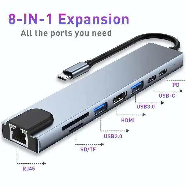 IN 1: USB-C hub adapter is compatible with all devices that include Type-C/USB ports, especially for MacBook Pro and Air. 8-in-1 USB-C HUB includes USB 3.0 port, USB 2.0 port, USB C port, PD port, 4K HDMI video output, RJ45 100M Ethernet interface and SD / Micro SD card reader slots, compatible with MacBook Pro / Air, Chromebook and more Type-C devices. So that you can solve the problem of a single laptop interface anytime and anywhere. ^^ 4K