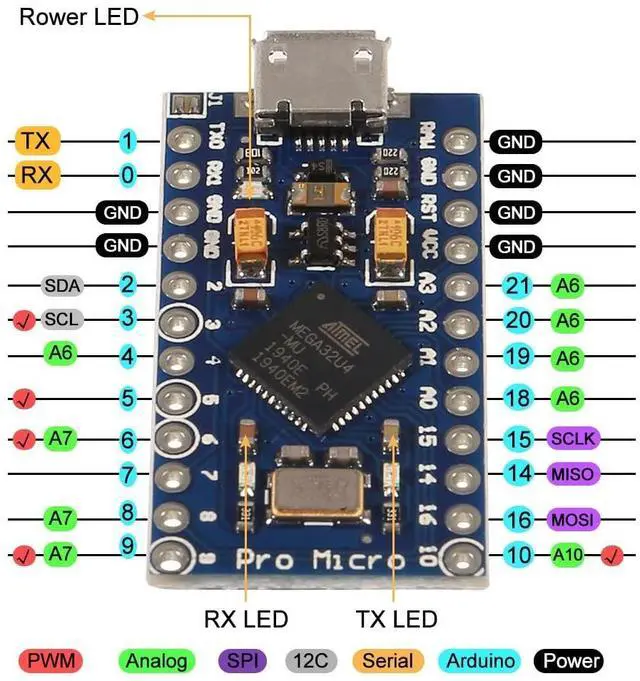 ATmega32U4 running at 5V/16MHz ^^ Supported by IDE v 1.0. 1 ^^ Rx and Tx Hardware Serial Connection ^^ 4 x 10-bit ADC pins, 12 x Digital I/Os ^^ On-Board Micro-USB connector for programming