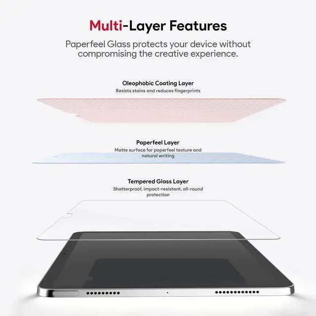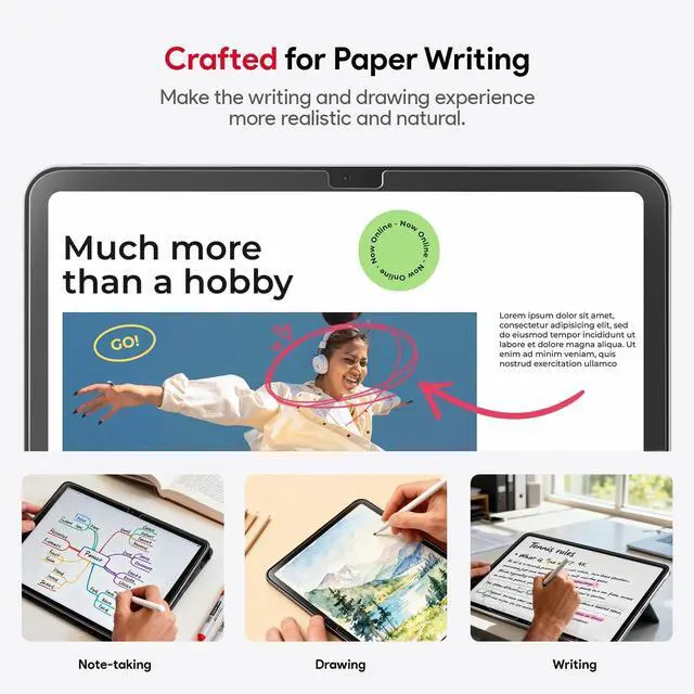 Hardness & Paperfeel: High-quality tempered glass material of the bottom layer can effectively resists scratches and alleviate high-impact drops, collisions and impacts from causing screen damage. At the same time, the a16 ipad screen protector surface layer use high-quality paperfeel material imported from Japan to bring the same texture and use feeling as paper ^^