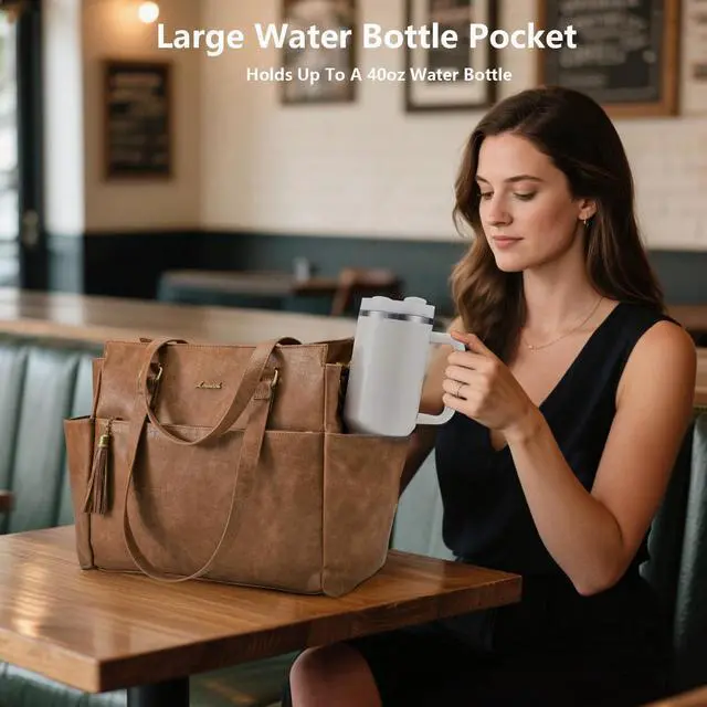 The laptop bag is made of high-quality PU leather, which is waterproof, scratch-resistant and wear-resistant, ensuring reliability for long-term use. With its retro-inspired aesthetic, this tote bag for women exudes sophistication and charm, perfect for the modern women. ^^ The work bag features two large side pockets that can hold a 40oz water bottle, making it perfect for long commutes or all-day meetings. ^^ Womens laptop tote bag with a padded compartment for 15.6 -inch laptops and iPads. Features multiple interior and exterior pockets, including slip pockets, two water bottle pockets, and zippered pockets, providing ample space for all-day essentials.