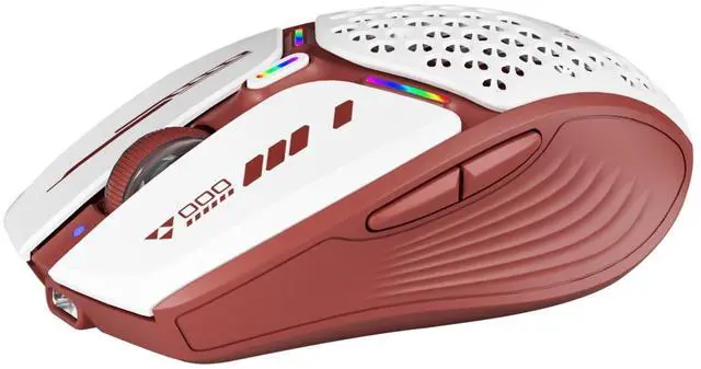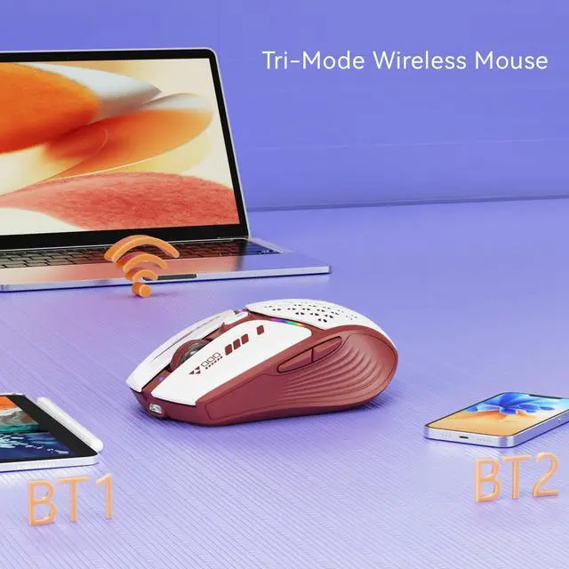 TRI-MODE WIRELESS MOUSE: With bluetooth 5.0 / 5.1 dual modes and 2.4GH z (USB Receiver and Type C Adapter) wireless connection technology to meet your multiple needs, just one mouse can easily seamlessly transition between three devices, allowing you to more skillfully complete multiple tasks from desktop to laptop to iPad and other devices with USB and USB C port devices. ^^ INNOVATED HONEYCOMB & MAGNETIC COVER DESIGNThe honeycomb & magnetic cover design of the back shell of the mouse not only has a beautiful and unique mecha-style appearance but also has a very practical function with breathable heat dissipation, and the USB receiver is stored in the mouse and just needs to remove the magnetic cover and take out. It's convenient, and don't worry about losing your mini USB receiver. ^^ USB C RECHARGEABLE MOUSE WITH BATTERY INDICATOR: Say goodbye to power outage anxiety. Built-in rechargeable battery, design charging indicator (in front of the wheel) and battery level visible (behind the mouse), make it easy to charge the mouse and know the power status of the mouse at all times. ^^