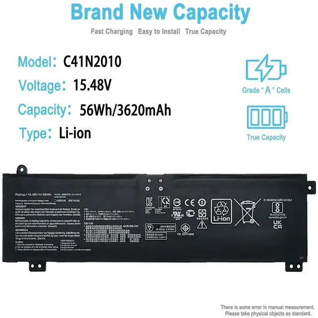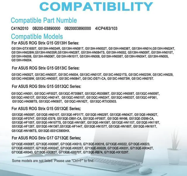 Condition: 100% brand new from manufacturer. ^^ Replacement Battery Part NumbersC41N2010, 0B200-03890000, 0B20003890000, 4ICP4/63/103. ^^ Compatible ModelFit for ASUS ROG Strix G15 G513IH-GTX1650T, G513IH-HN034R, G513IH-HN081T, G513IH-HN002T, G513IH-HN036T, G513IH-HN014, G513IH-HN024T, G513IH-HN026W, G513IH-HN035R, G513IH-HN026T, G513IH-HN084TS, G513IH-HN002, G513IH-HN009T, G513IH-HN015T, G513IH-HN006, G513IH-HN006T SeriesFit for ASUS ROG Strix G15 G513IC-HN002T, G513IC-HN003T, G513IC-HN004, G513IC-HN013T, G513IC-HN021TS, G513IC-HN023W, G513IC-HN029, G513IC-HN039W, G513IC-HN055T, G513IC-HN064T, G513IC-DS71-CA Series. ^^ Compatible ModelFit for ASUS ROG Strix G513QC-HN001, G513QC-HF002T, G513QC-R735B6T, G513QC-R535B6T, G513QC-HN008T, G513QC-HN009T, G513QC-HN013T, G513QC-HN014T SeriesFit for ASUS ROG Strix G513QE-HN009T, G513QE-HN010T, G513QE-HF017T, G513QE-HN029T, G513QE-HN042T, G513QE-HN062T, G513QE-HF074T, G513QE-ES76, G513QE-HF093T, G513QE-WH96, G513QE-DS99-CA SeriesFit for ASUS ROG Strix G713QE-HX008T, G713QE-HX009T, G713QE-HX013, G713QE-HX016, G713QE-HX022, G713QE-HX023, G713QE-HX023T Series. ^^ Compatible ModelFit for Asus TUF Gaming A15 FA507 FA507RC FA507RR FA507RM FA507RE Series: FA507RC-HN019W, FA507RC-HN083W, FA507RR-HF004, FA507RR-HQ007W, FA507RR-HF013X, FA507RM-HN003, FA507RM-HN103W, FA507RM-HN123W, FA507RM-R6725, FA507RE-HN006W. Fit for Asus TUF Gaming F15 FX507 FX507ZC FX507ZR FX507ZM FX507ZE Series: FX507ZC-HQ120W FX507ZR-HQ003W FX507ZM-HF076W FX507ZE. ^^ Security/QualityAll batteries are UL, CE, FCC, RoHS safety certification, built-in over charge, over discharge, over temperature, short circuit protection. The battery offers up to 1000 charge cycles and uses grade A battery cells to improve charging speed and battery performance, ensuring performance and durability. ^^ After-Sales SupportWe support 30 days refund, 12 months warranty (refund or replace battery), 24 x 7 mail support. return window will close one month after you receive the product and you can contact us by placing your order or by clicking " Ask a question" on the seller's page.