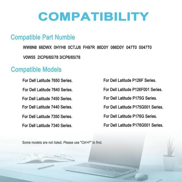Condition: 100% brand new from manufacturer. ^^ Replacement Battery Part NumbersWW8N8 66DWX 0HYH8 0CTJJ6 FH97R 86D0Y 086D0Y 047T0 0047T0 V0W55 2ICP6/65/78 3ICP6/65/78. ^^ Compatible ModelFor Dell Latitude 7650 Series; for Dell Latitude 7640 Series; for Dell Latitude 7450 Series; for Dell Latitude 7440 Series; for Dell Latitude 7350 Series; for Dell Latitude 7340 Series; for Dell Latitude P126F Series; for Dell Latitude P175G Series; for Dell Latitude P176G Series; for Dell Latitude P175G001 Series; for Dell Latitude P176G001 Series; for Dell Latitude P126F001 Series. ^^ Security/QualityAll batteries are UL, CE, FCC, RoHS safety certification, built-in over charge, over discharge, over temperature, short circuit protection. The battery offers up to 1000 charge cycles and uses grade A battery cells to improve charging speed and battery performance, ensuring performance and durability. ^^ After-Sales SupportWe support 30 days refund, 12 months warranty (refund or replace battery), 24 x 7 mail support. return window will close one month after you receive the product and you can contact us by placing your order or by clicking " Ask a question" on the seller's page.