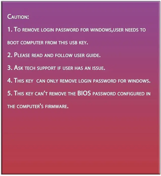 Bootable Key: To remove login password, user needs to boot computer from this USB key and it supports legacy BIOS/UEFI, secure boot mode as well as 32/64bits PC/OS and it should work with most of brands laptop and desktop. ^^