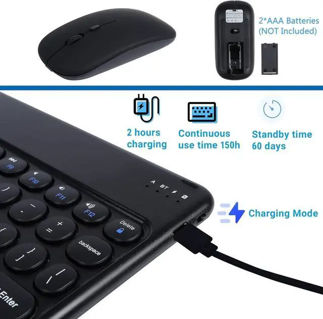 SpecificationThe wireless keyboard is in compact size designsaving the space on your desk. The mouse is ambidextrous to fit in both left and right hands. When the wireless keyboard is kept fully charged, it can last 150 hour and standby time is 60 days to meet office needs. Keyboard typing comfortable and light, fast connection to the computer, to achieve accurate typingHere's the steps of connection: Please check if the mouse and the keyboard are out of power first. 1. How to connect the wireless mouse: Bluetooth 5.2