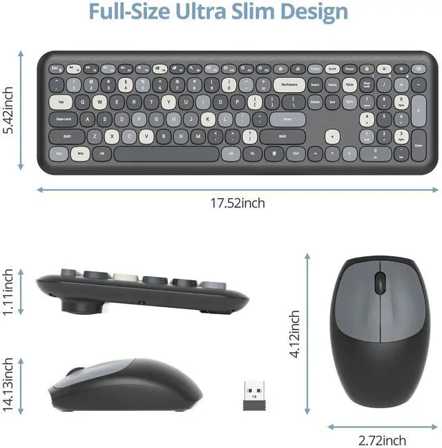 Women Girls: With a smooth, soft matte surface, this dark pink wireless keyboard and mouse set is lightweight, skin-friendly, and comfy. The fullsize colored keyboard with number pad maintains an optimum angle, while the silent mouses curved surface supports correct postureideal for women and girls seeking both style and ease ^^ Cute Gradient Hues & Round Keycaps: The stunning colorful black colorway adds a fresh, vibrant touch to your workspace, turning a plain desk into an inviting spot youll love. The silent round key keyboards rounded keycaps fit wrist height, with light, fast, silent buttonsmaking it a fun, colored keyboard with number pad for girls boys women ^^ No Additional Installation & No Latency: As part of aesthetic office supplies for women, this cordless fun keyboard and mouse wireless set shares one receiver, supporting plug-and-play with no drivers needed. Blending typewriter office retro vibes with modern tech, its a seamless addition to any workspace. ^^ Low Power Consumption, Auto
