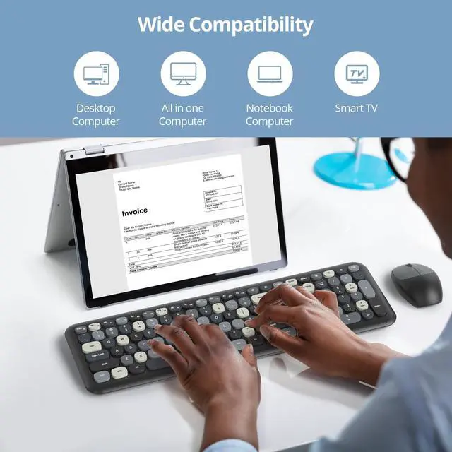 Soft Click: This aesthetic keyboard and mouse wireless setalso a quiet keyboard and mouse wireless combois designed for noise reduction, making it perfect for offices, homes, or public areas without disturbing others. As a silent round key keyboard, it reduces click noise by 70% when tapping, while the mouse cuts 98% of clicking noise, ensuring a quiet environment. ^^ 104 Fullsize Colored Keyboard with Number Pad for
