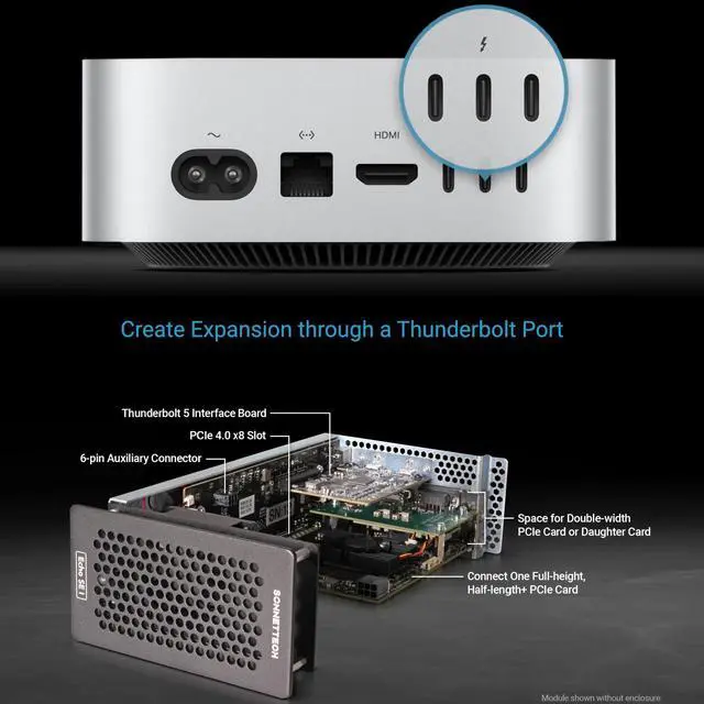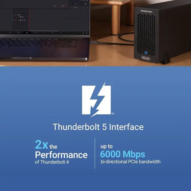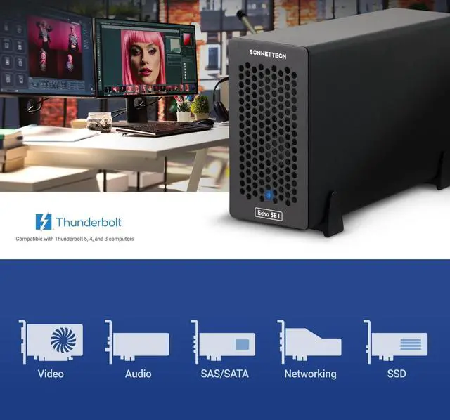 The Echo SE I T5 is a Thunderbolt 5 Expansion system compatible with Thunderbolt 5, 4 and 3 computers. A 1-slot Desktop Thunderbolt 5 to PCIe Card Expansion System for Computers with Thunderbolt or USB4 Ports. Connect One Full-height, Half-length+ PCIe Card (Plus Daughter Card). This compact, single-slot system compatible with Apple M series Macs, Intel Macs with Thunderbolt 3 ports, plus Windows and Linux computers with Thunderbolt 5 or 4 or USB4 ports enables you to easily connect almost any Thunderbolt compatible, non-GPU PCIe card to your computer via an included Thunderbolt 5 cable.