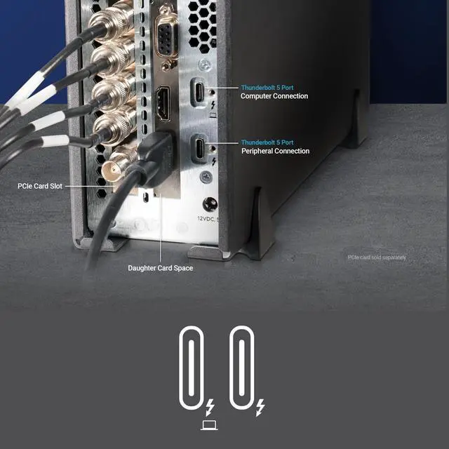 This compact, lightweight Thunderbolt 5 to PCIe expansion system adds connectivity and improves capabilities by connecting a high-performance PCIe card to your computer at up to 6000 MB/s bi-directional bandwidth, supporting one half-length+ full-height PCIe 4.0 card (plus daughter card), providing auxiliary power and a second Thunderbolt port with 15W for peripherals, enabling daisy-chaining, offering temperature-controlled quiet cooling, delivering rugged aluminum protection, and featuring smart power management that automatically powers on and off with your computer.