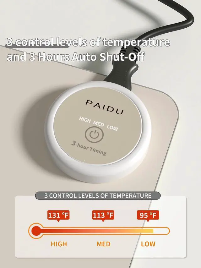 3-Gear Temperature Control, 3-Hour Auto Shut-OffThis intelligent electric heated mouse pad has 3 Heat Mode to meet the temperature needs of most people.And 3-Hour Auto Shut-Off Function to help you saveenergy and prevent excessive Accidents occur when used or unattended.