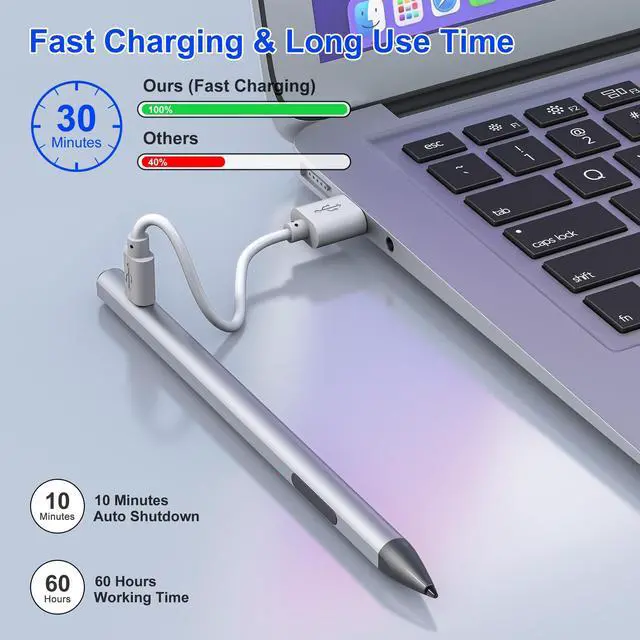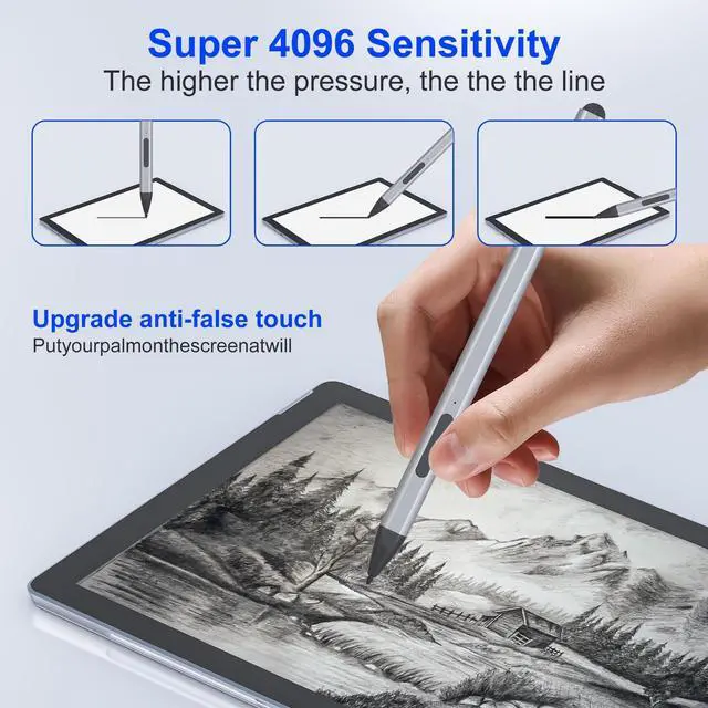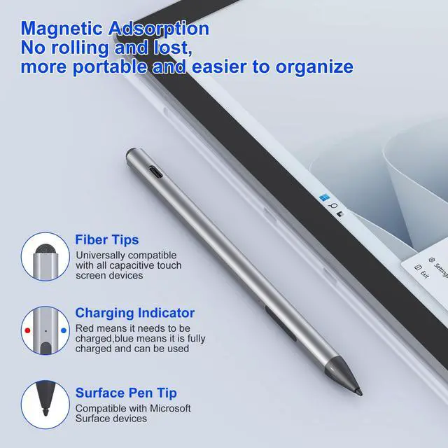 Type-C Fast ChargingThe Surface Pro pen can be fully charged in just 30 minutes, with up to 60 hours of battery life. 5 minutes of charging = 10 hours of work. With the LED indicator Light, you can see the battery status in time. Blue light means it is fully charged/in use; Red light means the battery is low/charging. Perfect for students, business people, and creators who take notes and draw frequently. ^^ 4096 Pressure Sensitivity &