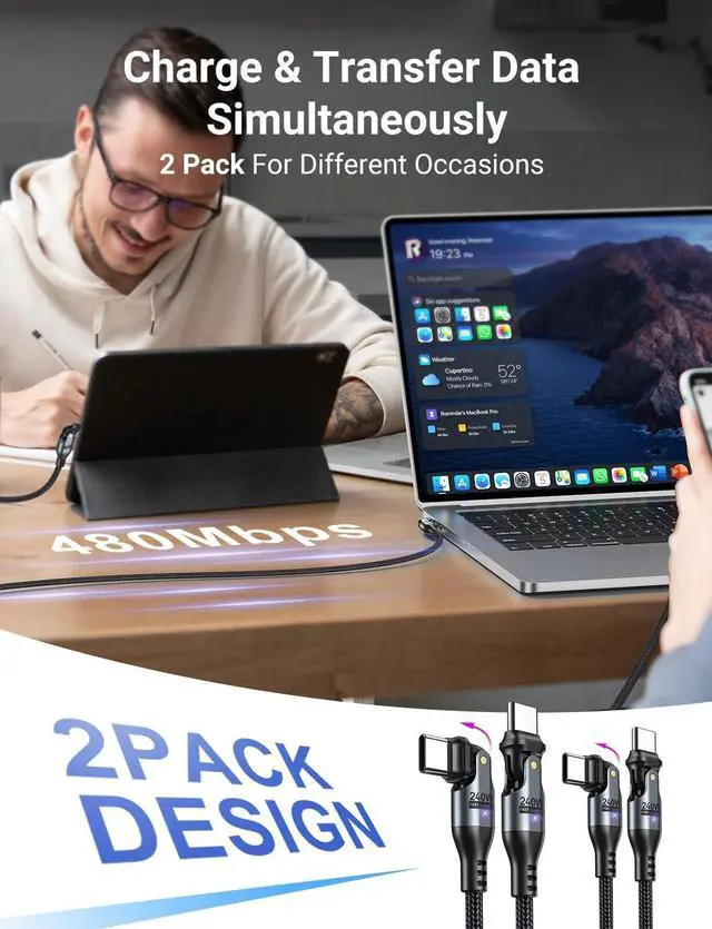 ^^: AUFU 240W USB-C to USB-C cable features a revolutionary dual-head right-angle design that provides ultimate comfort while making it easy to carry. The dual-head 180 design is designed to enhance your daily connection experience, making it easier and more comfortable to play games, watch videos or read e-books while charging.