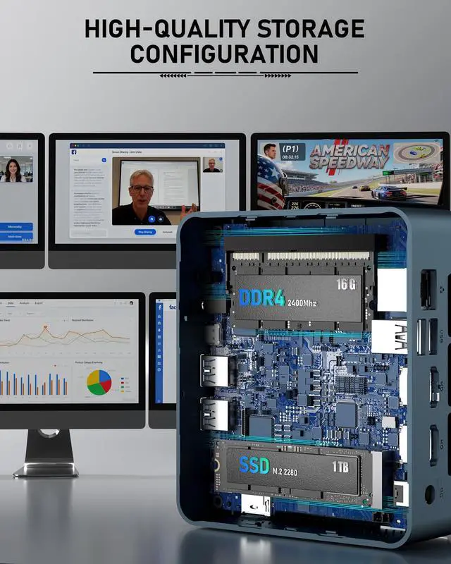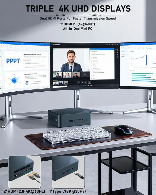 Ryzen 5 3550H Mini Computer ^^ 16GB DDR4 RAM & 1TB SSD, Expandable Storage - Features 16GB DDR4 RAM for smooth app switching and a 1TB SSD for fast boot-ups and quick file access. The SSD is expandable up to 2TB, giving you flexibility to grow your storage as needed. ^^ 4K Triple Display & Rich Connectivity - Support 4K@60Hz output via dual HDMI and Type-C ports for triple-screen setups, boosting productivity. Includes USB 3.2, USB 2.0, Gigabit LAN, audio jack, and more to connect monitors, projectors, and peripherals without lag.