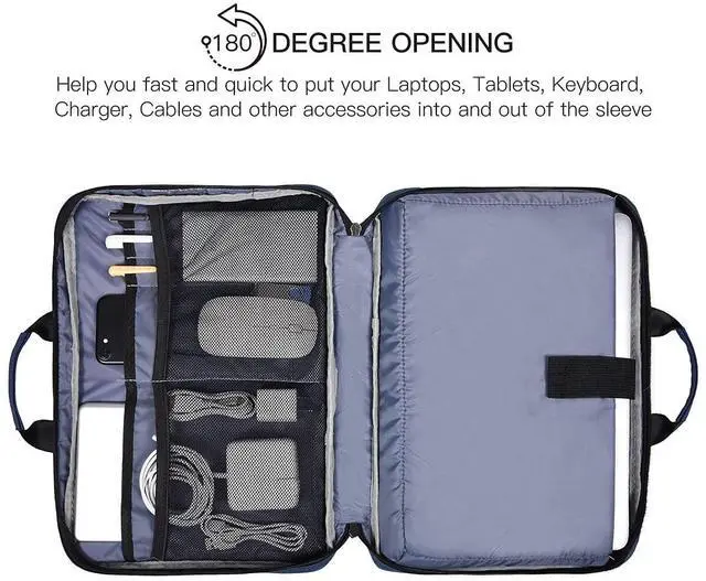 ^^ MULTI ORGANIZER DESIGN: The 15.6 Inch laptop sleeve case bag has one main compartment perfectly for 15.6 inch laptops or notebooks, and another side has 4 mesh bags, which can easily store your power adapters, mouses, tablets, cables, cell phones, chargers, headphones, etc., and there are 3 small slots to hold your little gadgets such as Apple Pencil, surface pen or other stationery.