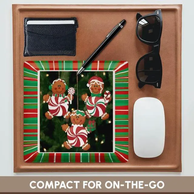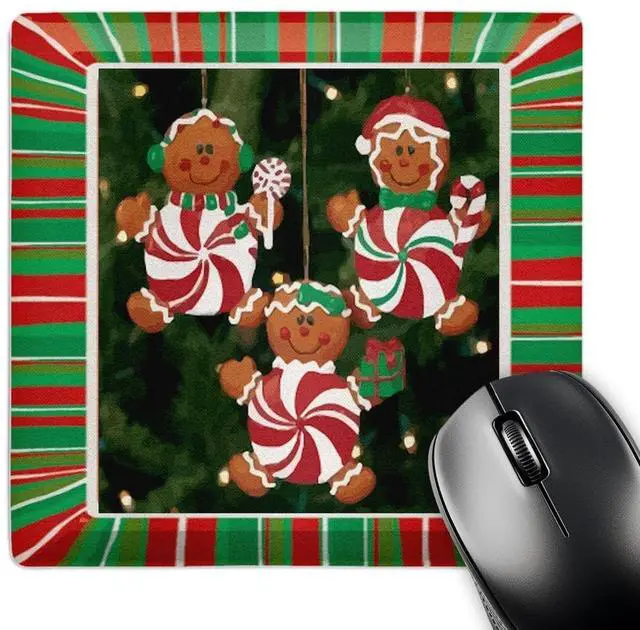 Peppermint Gingerbread Ornaments Mouse Pad is 8" x 8" x. 25" and is made of heavy-duty recycled rubber. Matte finish image will not fade or peel. Machine washable using a mild detergent and air dry.