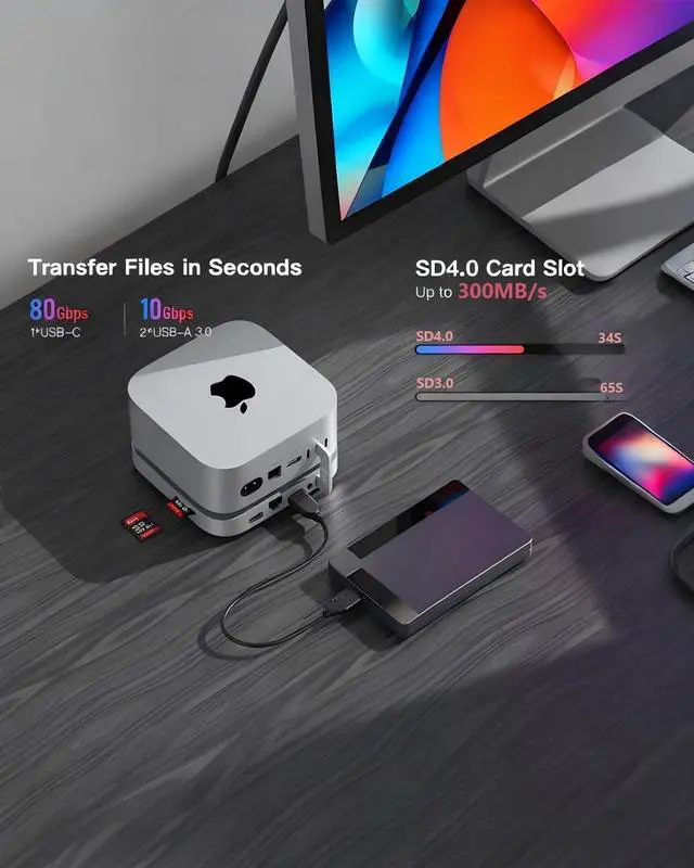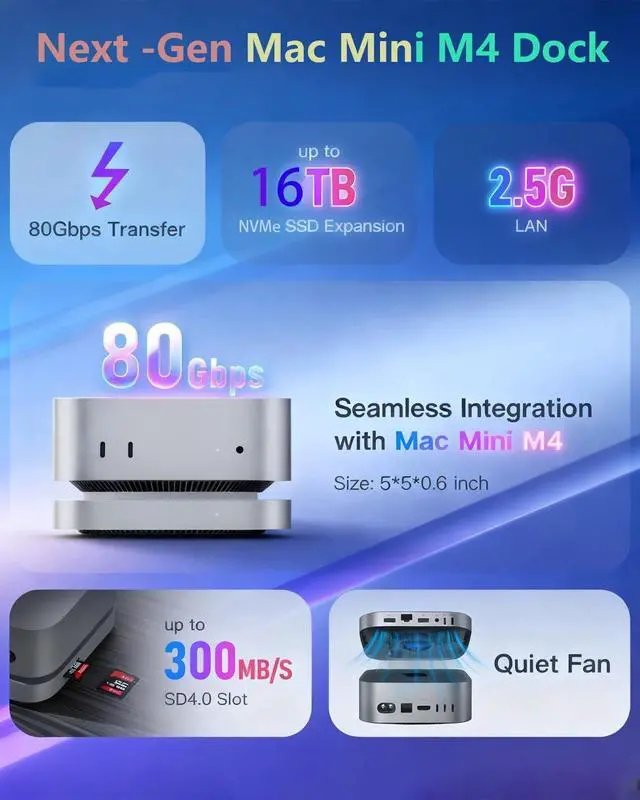 Expandable Storage: The Mac Mini M4 dock with dual M. 2 2280 (PCIe 4.0 x2) NVMe SSD slots. Supporting M. 2 2280 PCle 3.0 / 4.0 / 5.0 SSDs (Not included SSD), it expands storage up to 16TB (28TB). Whether you need extra space for raw footage, project files, or backups, this dock lets you scale storage without sacrificing speed. Its designed to keep your desk clutter-free while handling all your high-capacity storage needs ^^ 80Gbps
