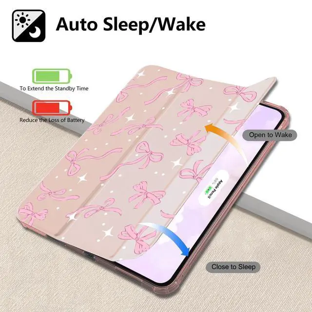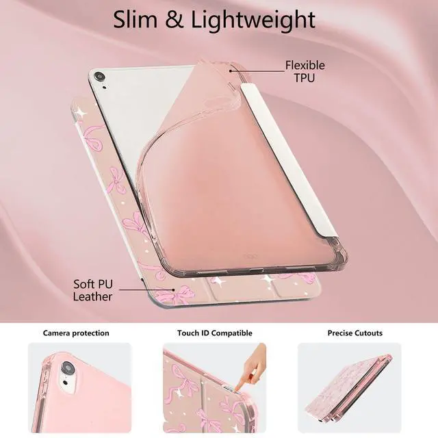 Protection: This cute Aesthetic Ribbon case for ipad is made of two materials. The comfortable and soft silicone and high-quality durable TPU material provide a comfortable touch for the pad. The back of this girly lovely bow print case for ipad is made of soft TPU, which provides full body protection and is more durable than traditional silicone materials. It is less prone to yellowing, prevents scratches, and maximizes the protection of your pad from damage and scratchesAuto Wake/sleepBuilt-in magnetic strip, our girly lovely bow print case for ipad can automatically wakes or puts your tablet to sleep when the lid is opened and closed, protecting and extending battery life; precise cutout also completely supports newest touch ID key function. Built in pen holder ensures the safety of your pencil. Adjustable angleThe trifold stand shell design of this cute Aesthetic Ribbon case forapple ipad can easily change the angle to meet your viewing and typing needs. This lovely watercolor case for ipad can be folded into a stable triangle, firmly supporting your pad. Whether it's work, study, or watching movies, they can meet your needsPerfect