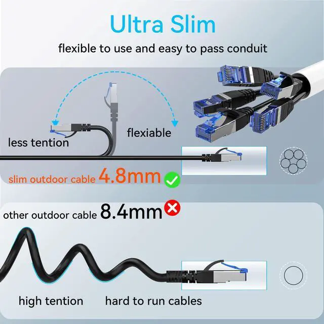 ^^ Weather Resistant - Direct burial long ethernet cable are durable and have a sturdy, weather-resistant outer jacket that can withstand rain, snow, wind, and harsh sunlight. Outdoor cat8 cable will not wear, crack or degrade after long-term outdoor operation to ensure a stable and continuous high-speed network connection.