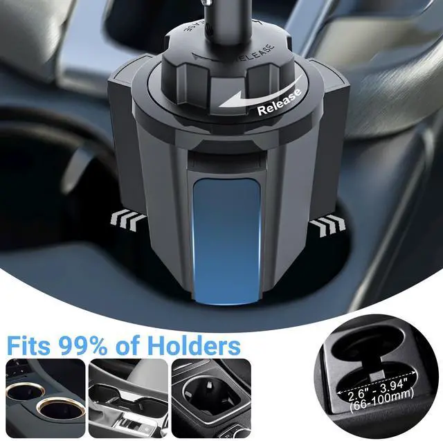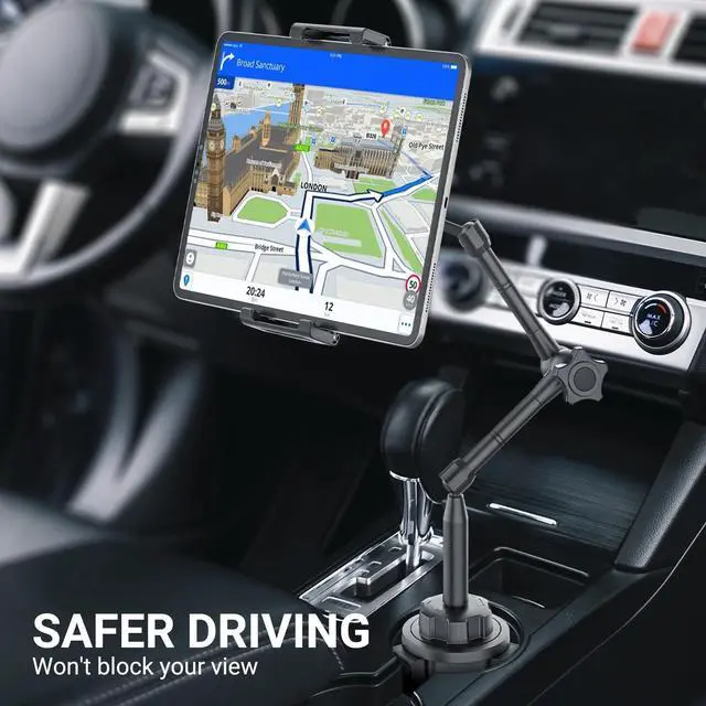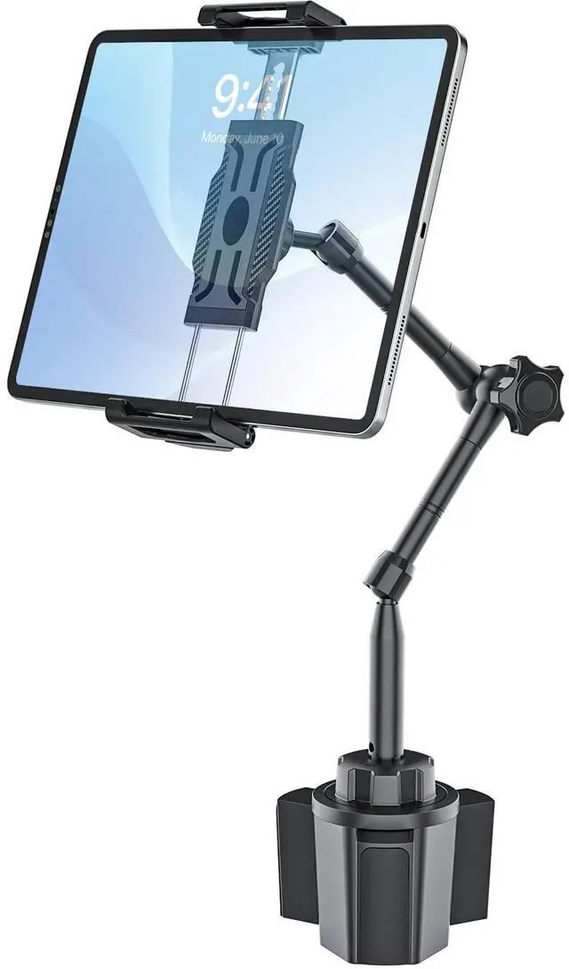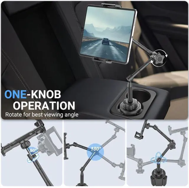 Metal ArmThe tablet arm is made of high-strength metal material to ensure that the mount is stable and does not shake. Whether it is a sharp turn or a bumpy road, it can provide solid support for the tablet, protect your devices. ^^ Fits 99% of Cup HoldersThe base of the car tablet holder is adjustable from 2.6" - 3.94" (66-100mm), which can fit most of the cup holders of cars, making it compatible not only with cars but also with trucks, RVs, boats, golf carts, treadmills etc. ^^ 360 RotationThe bracket is composed of two 4.13 inch metal arms.