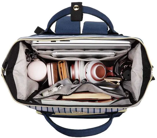 Fits up to 17"laptop, Dimensions: 17x 12.5 x 7.5, Weight: 1.96 lb ^^ Gold hardware, elastic water bottle pocket, stripe liner, with a USB charging port and trolley sleeveAnti-thief back pocket ^^ Roomy and sturdy, organized compartments, It's sturdy enough to stand and not flop over when packed, and you will enjoy the way it opens and stays open! you can find everything you need in it without fumbling blindly into a dark bottom ^^ MULTIPURPOSE - Its simplistic, stylish stripe color contrast look makes it as a laptop backpack, work backpack, travel backpack, college backpack as well as backpack. It's also light on your back, even with textbooks, folders, and laptops inside.
