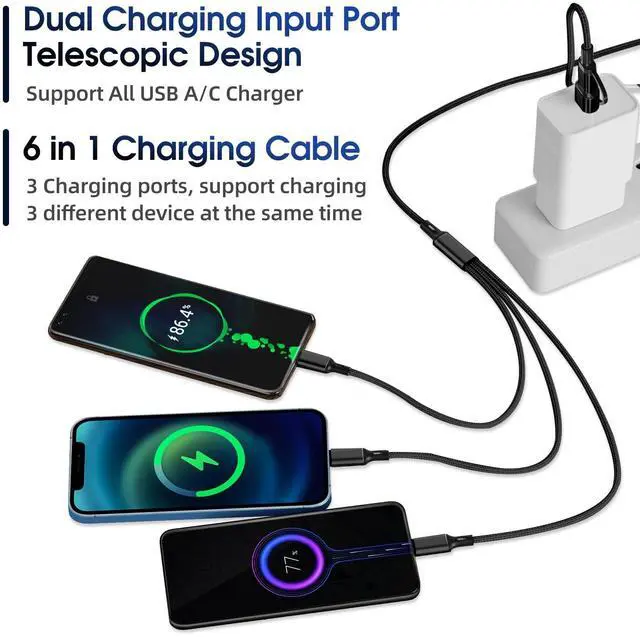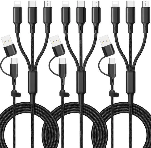 Multi-Functional Charging CableThis 6-in-1 multi head charging cables features 2-in-1 USB A & USB C port to 3 in 1 charging head Type C/Micro USB/i-Product connectors. One cable meet your different charging demands. Solves different ports adapters and various electronic devices. (For optimal charging, please use a 5V/3A charging adapter). ^^ Universal Multiple Charger CableMulti USB cable works with All USB Type-C/micro USB/ iProduct devices. 3A nylon braided high speed multi charging cord, compatible with Phone 14 13 12 11 Pro Max / 14 13 12 11 Pro / 13 12 Mini / 14 Plus / 14 / 13 / 12 / 11 / SE / Xs Max / Xs / Xr / X / 8 Plus / 8 / 7 Plus / 7 / 6s Plus, Pad Air / Pro, / Samsung Galaxy S22+ / S22 / S21+ / S21 / S20+ / S20 / 210+ / S10, HTC, LG, Sony, Google Pixel, Moto and other Android devices for most mobile phone charging.