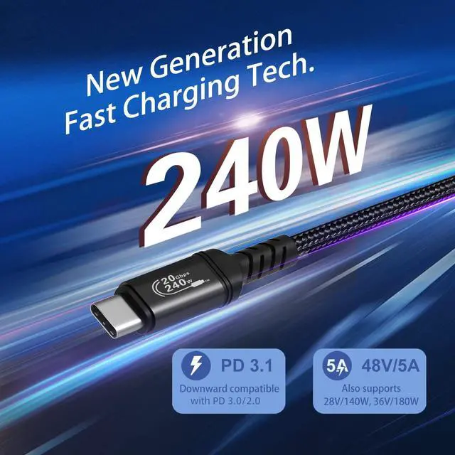 240W USB C Cable: Besgoods USB C to USB C cable is conform with PD3.1 Extended Power Range (EPR) in 48V/240W, 36V/180W, 28V/140W. With this latest fast charging technology, it could replace all other 100W or 60W USB C cables. In the future, more and more device will support powerful fast charging, this cable could meet all you need at least in the next 5 to 10 years.