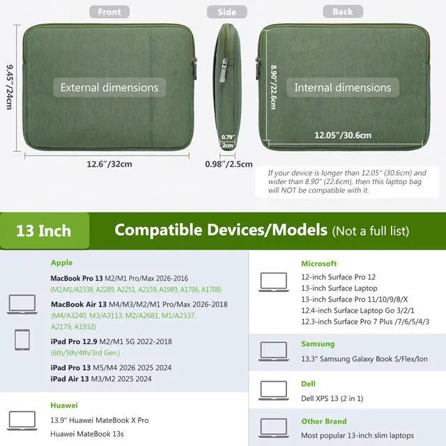 Internal Dimensions: 12.05" x 8.9" x 0.79". Compatible with MacBook Air 13 M4/M3/M2/M1 2025-2018 (A3240, A3113, A2681, A2337, A2179, A1932), MacBook Pro 13 M2/M1 Pro/Max 2025-2016 (A2338, A2289, A2251, A2159, A1989, A1706, A1708), Dell XPS 13, 13"- 12.3" Surface Pro, 12.4" Surface Laptop Go, iPad Pro 13 M4, iPad Air 13 M3/M2, iPad Pro 12.9 2022-2018, Huawei MateBook 13s, 13.9" Huawei MateBook X Pro, 13.3" Samsung Galaxy Book S/Flex/Ion, and most 12"-13" slim laptops/tablets, etc. ^^ 360