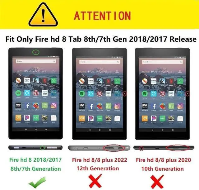 Generation)Compatibility: Compatible with Fire HD 8 Tablet 8th Generation, 2018 ReleaseCompatible with Fire HD 8 Tablet 7th Generation, 2017 ReleaseCompatible with Fire HD 8 Tablet 6th Generation, 2016 ReleasePlease note that this case ONLY fits the above models and will NOT be compatible with other Kindle Fire tablets not mentioned in this listing. Please go into ''Settings'' and tap the ''Device Options'' entry, then you can find the Model Name (and generation) of your Fire Tablet.