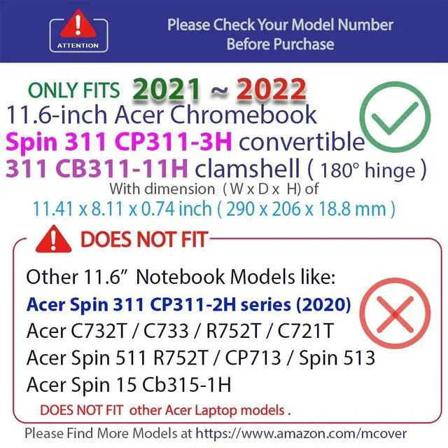 NOTE: Before placing order, PLEASE make sure to verify your laptop model number as this case is MODEL specific and NOT interchangeable. ^^ NOT fitting other 11.6 -inch Acer laptops. NOT compatible with ANY other laptops as well. ^^ Made of high-quality translucent polycarbonate material which is shatter-proof and will protect your 2021~2022 11.6" Acer Chromebook 311 CB311-11H (180 Hinge) & Spin 311 CP311-3H Series Convertible Laptop Computers all around ^^ Designed to perfectly fit the 2021~2022 11.6" Acer Chromebook 311 CB311-11H (180 Hinge) & Spin 311 CP311-3H Series Convertible Laptop Computers with dimension of 11.41 x 8.03 x 0.8 inch ( 290 x 204 x 20.85 mm ) ^^ 2-piece light-weight ( 8.3 oz or 235 g ) shell easily snaps on and off.