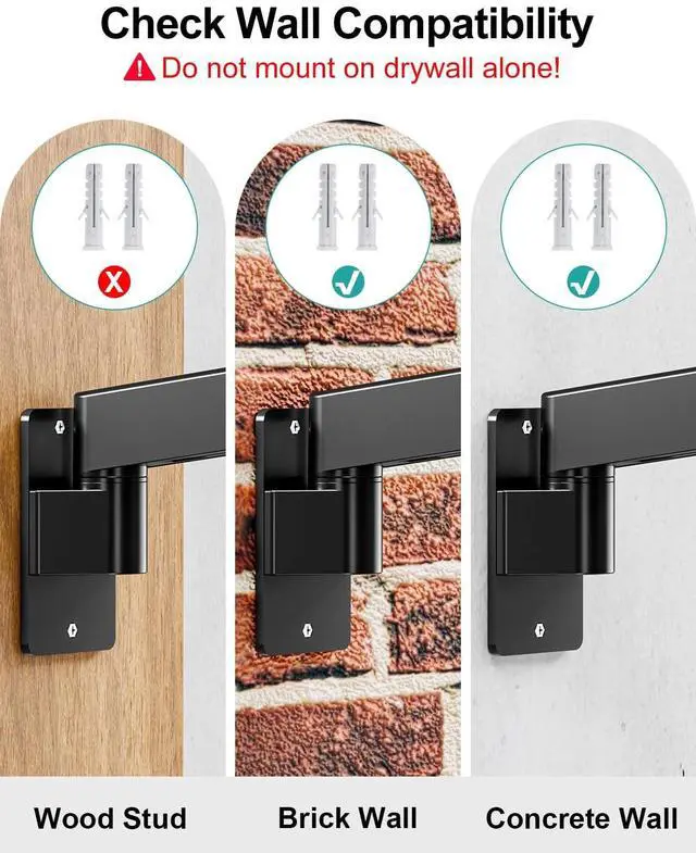 Crafted from premium steel and featuring upgraded gas spring tested to withstand 20, 000 lift cycles. Effectively reducing wobbling during use and keep the screen stable ^^ Effortless Installation - Eqipped with detailed instructions and labeled hardware for hassle-free installation. Designed for wood stud, solid concrete and brick wall. Please verify wall type before wall mount purchase.