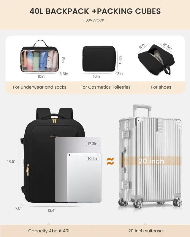 Airline Approved Personal ItemWith 18x14x8 inches, the carry on backpack can fit in overhead compartments and under airplane seats. The 180-degree opening design for compartments expedites security checks, making your airport experience as smooth as your travels. ^^ Ergonomic Comfort for Every AdventureLOVEVOOK travel backpack features a waist belt that shifts weight to your hips, easing shoulder strain and boosting stability on rough terrain, while keeping the pack secure. Adjustable shoulder straps ensure a perfect fit for lasting comfort on long journeys. ^^ 40L Large Capacity & Multiple PocketsThe travel backpack for women with 3 main compartments and 18 pockets, can meet both your daily and travel needs for a 3-5 day trip.