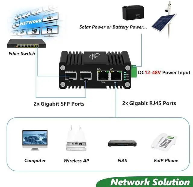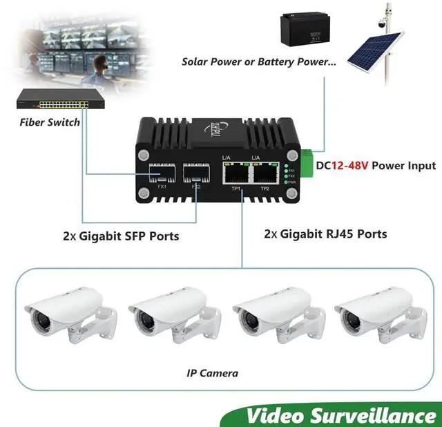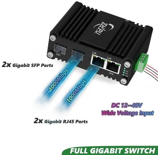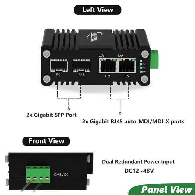 Overview: The Industrial Gigabit 2-Port Switch has 2 Gigabit SFP port and 2 RJ45 port. Each port supports gigabit transfer speeds, ensuring lightning-fast data transmission. With the industrial IP40 Al case, it can thrive in extreme environments between -40F and 176F, making it ideal for outdoor installations or industrial applications.