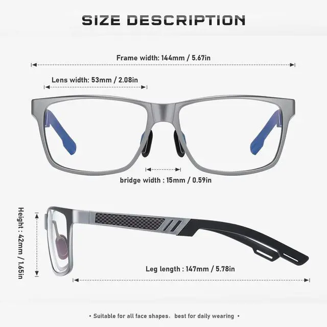 ^^ High quality gaming glassesUpgraded aluminum-magnesium alloy frame for lighter weight. With high strength, extrusion resistance. Matching TEP material, non-slip, enhance the comfort of wearing. ^^ Perfect for All occasionsReglaaly Anti-Blue Light glasses are perfect for use in the office, reading, computer games. Let the casual frame design make you look professional and stylish while working or playing video games. ^^ Comfortable to wearThe adjustable nose rest and flexible hinge design make the glasses fit your face better and can be adapted to any face shape.