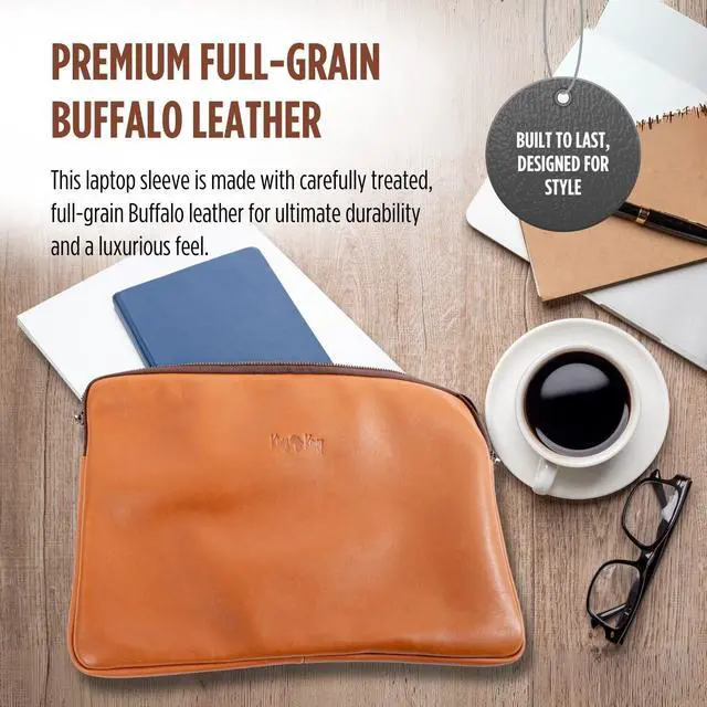 Premium Full-Grain Buffalo Leather Laptop Sleeve: Crafted from genuine full-grain buffalo leather, this leather laptop sleeve combines sophistication and durability. Designed to age beautifully, its the perfect leather laptop pouch for your Mac laptop ^^ 14'' Leather Laptop Sleeve with Soft Padding And