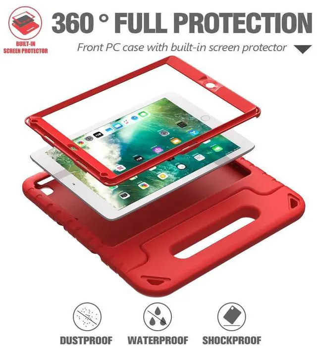 Compatible with iPad 9.7 -inch 2017 (iPad 5th generation) / New iPad 9.7 2018 Release (iPad 6th generation) / iPad Air 2/ iPad Pro 9.7, NOT for iPad Mini or other tablets. iPad 6th generation (A1822/A1823)/ iPad 5th generation (A1893/A1954) iPad Air 2 (A1566/ A1567)/ iPad Pro 9.7 (A1673/A1674/A1675) ^^ 180 degree rotatable grip handle provides extra security, and can also be folded back into a stand for a horizontal viewing or typing position. ^^ With Built-in Screen Protector. Anti-slip silicone soft outer layer case provides great handling and extra cushion for impact protection.