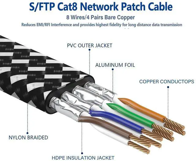 Higher Speed3 FT 5-Pack Cat 8 Shielded Ethernet Cable provides performance of up to 40000 Mbps (or to 40 Gigabit per second); High bandwidth of up to 2000 MHz, high-speed data transfer for server applications, cloud storage, online HD video streaming, and gaming without any lag or stop. With Orbram Cat8 ultra-fast patch cord, you won't worry about waste time for waiting. ^^ Anti-Interference DesignOrbram professional network cables are made of 4 shielded foiled twisted pair(S/FTP) copper wires with 24K gold-plated RJ45 connectors on each end. Compared to the Cat 7 network Ethernet cable, the additional shielding and improved quality in twisting of the wires provides better protection from crosstalk, noise, and interference that can degrade the signal quality.
