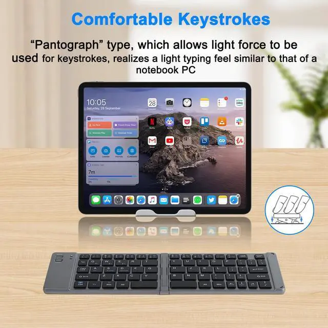 Foldable Design: Our foldable Bluetooth keyboard is designed for ultimate portability. Its foldable feature allows wireless bluetooth keyboard to easily fit into your bag or pocket, making foldable wireless keyboard perfect for on-the-go use. Whether you are in a coffee shop, airport, or office, its compact and foldable design allows you to create a portable workstation anywhere ^^
