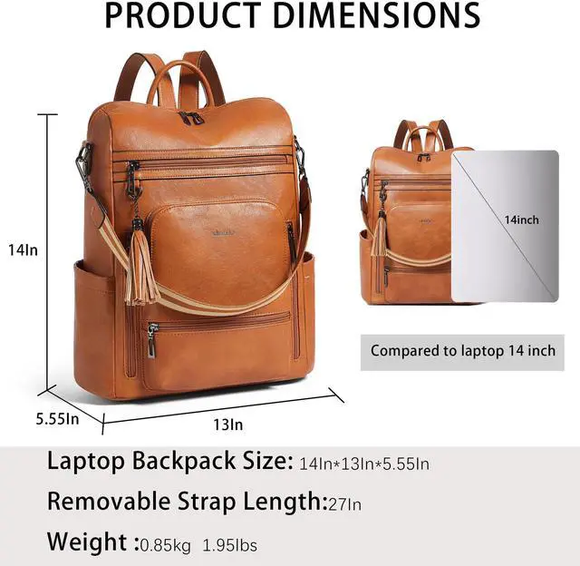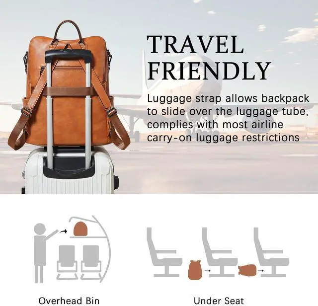 Leather Laptop Backpack for WomenMade of high quality waterproof Vegan leather, HEAVY DUTY & DURABLE. Total of 9 pockets, easy to organize all work necessities, college supplies, travel essentials. ^^ Practical Backpack Luggage Strap DesignDesigned for traveling, it helps you free your hands and back from the burden. Make your travel more convenient and enjoyable. Waterproof travel backpack fits under the seat also meets airline carry-on requirements. ^^ Large CapacityThe large capacity laptop backpack has multiple divider pockets, easy for holding laptop, ipads, Phone, binder, water bottle, umbrella, magazine, pens, wallet and so on.