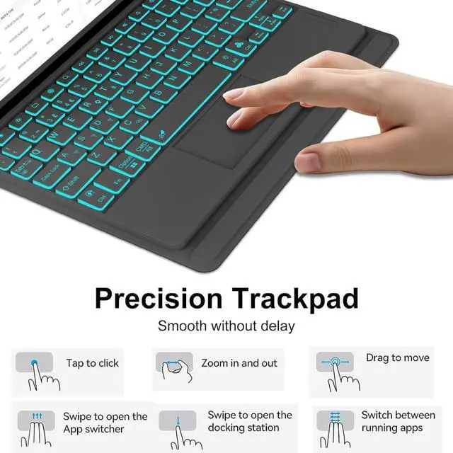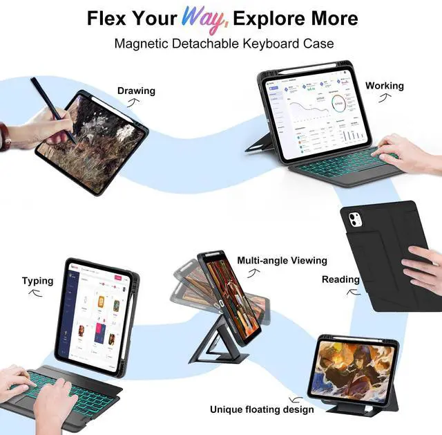Magnetic Detachable Keyboard Case Stand:The ipad keyboard and protective cover adopt a magnetic separation design, allowing for easy disassembly and connection.The central magnetic area is strong, allowing you to combine the protective cover and keyboard for daily work, study, and life. When the case and keyboard are separated, you can enjoy portrait mode, drawing mode, reading mode, and freestyle mode. Switching between iPad and Laptop modes becomes effortless