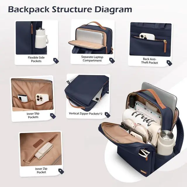 Stylish & Functional- Elevate your everyday style with our laptop backpack for women. Available in multiple color options, the backpack features a sleek design and a roomy interior to fit your daily essentials. Measuring 16.1" x 5.1" x 11.4" /41 x 13 x 29cm, it's perfect for work, travel, college, and so on. ^^ Roomy & Organized- The backpack's large capacity features a separate laptop compartment that can fit up to a 15.6" laptop, a spacious main compartment with 2 slip pockets and a zipper pocket. Outer with 2 vertical zipper pocket, 1 back anti-theft pocket, as well as a 2 side pockets and a luggage strap for added convenience.