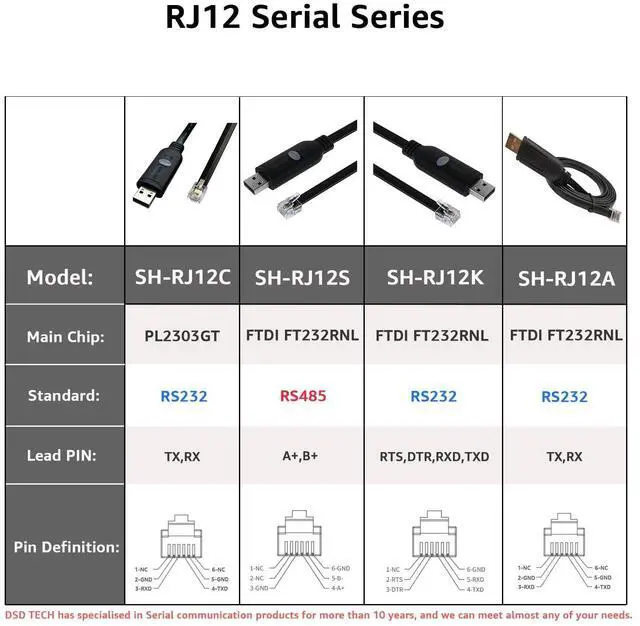 This USB to RS485 cable features a small RJ12 connector, which is designed for some specialized industrial equipment. Before using, please make sure its wiring sequence is consistent with your equipment, if not, you can contact DSD TECH for customization.