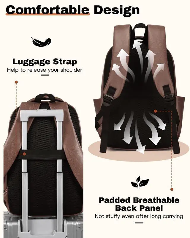 ^^ ORGANIZED STORAGE: The PU leather backpack features a minimalist design with 8 pockets that easily hold all your essentials for work, school, or travel. The front pockets are designed for small gear such as glasses, a passport, or earphones. The main compartment fits up to a 15.6 -inch laptop, plus binders, books, clothing, and daily gear. The side pockets are perfect for water bottles or umbrellas.