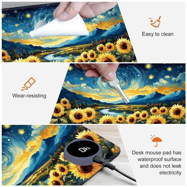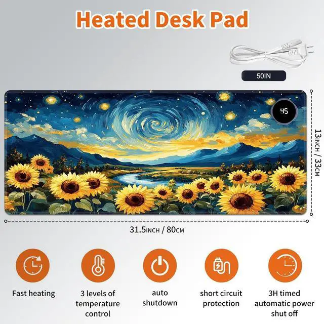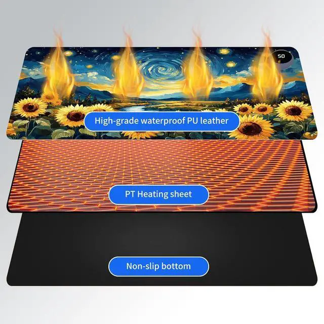 Heated Desk Mat with 3 temperature settings: --1. Low (40C / 104F) for gentle warmth--2. Medium (45C / 113F) for consistent comfort--3. High (50C / 122F) for a quick boost of heatAuto Shut-Off Design--Mousepad warmer includes 3-hour auto shut-off timers. Long-press the power button until it flashes to activate. helping you save energyDurable Material--Crafted from smooth PU leather, Gaming Mouse Pad Warmer features a waterproof and easy-to-clean surface--Heated Desk Mat Non-slip base keeps it securely in place, providing a stable surface for your keyboard, mouse, and laptopLarge & Multi-Functional Design--Large Mouse Pad at 31.5 x 13 x 0.08 inch (80x33x 0.2 CM) is spacious enough for your desk essentials, keeping your workspace neat and organizedPattern Printing Design--Unique Pattern Printing Heated Desk Pads decorate your study, computer desk, bedroom or office, perfect accessory for any modern office and homeNote: When using PU leather desk mat, do not place any items that are easily ignited or damaged by high temperatures, such as laptops, batteries, or other items that are not resistant to high temperatures. If you smell some leather odor during the first use, it will disappear after being left for a period of time. Due to long-term curling and cold weather, the sides of the heating mouse pad are slightly raised. After heating, warm mouse pad will return to a flat state.