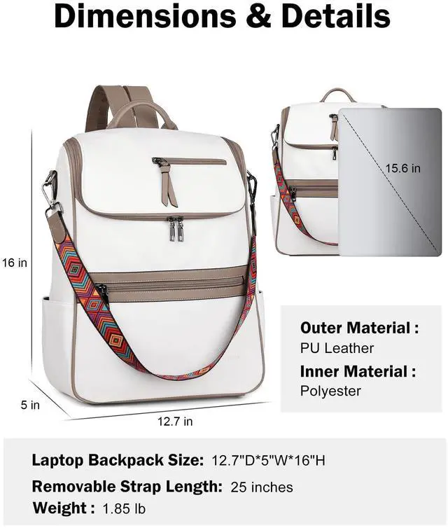Quality Materials: 12.7"W *5"D*16"H, 1.85 lb. This women's leather laptop backpack is made of the latest waterproof PU vegan leather, soft and retro, quality hardware, smooth zipper without sticking, and reinforced design at the connection between the shoulder strap and backpack, making the leather backpack more durable. So this is a sturdy and stylish laptop backpack.