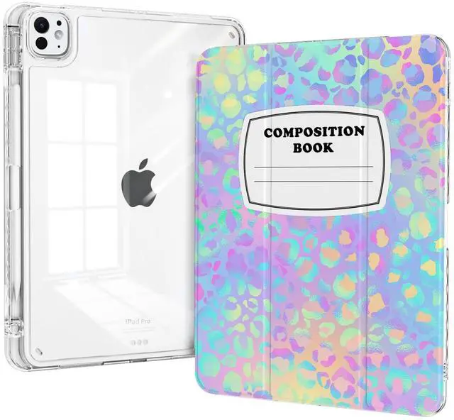 Piznernico Shockproof Case for iPad Pro 13 Inch M5 2025 & M4 2024 with Pencil Holder, Stable Trifold Stand, Slim Transparent Clear Back Cover, Auto Wake/Sleep, Leopard Composition Book
