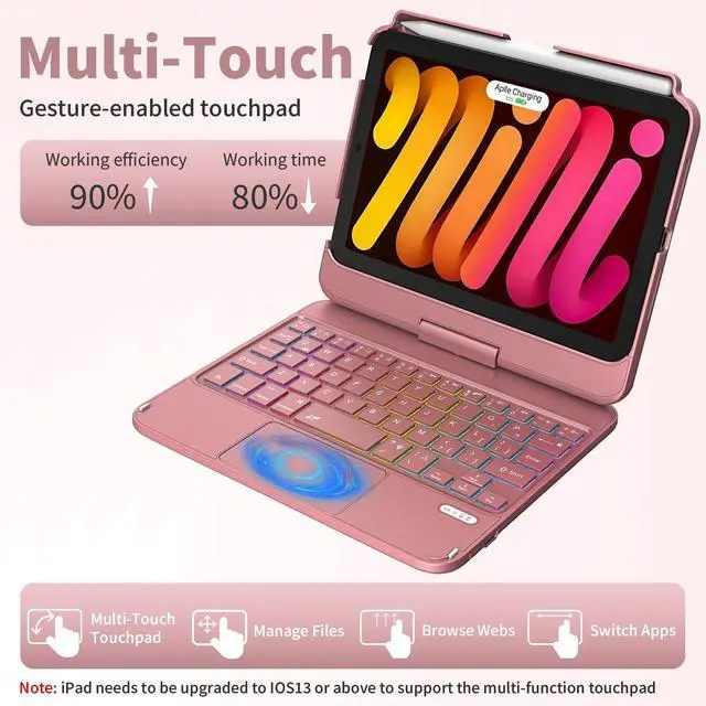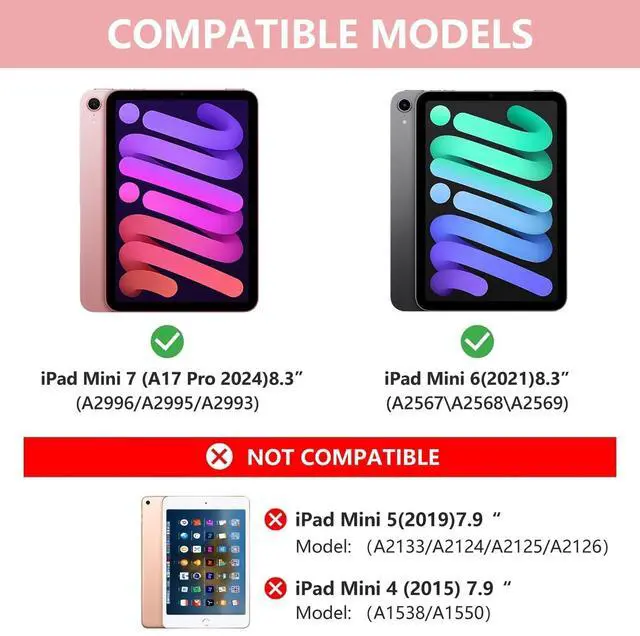 Model Number: A2996/A2995/A2993/A2567/A2568/ A2569. It is NOT compatible with any other devices; Please check back bottom of iPad to find the model number ^^ 7-Color Backlit KeyboardThe premium keyboard case for iPad mini 6th generation has 7 backlight colors and 3 brightness levels to adjust, light up the keys in the dark or dim light, provides you a comfortable typing experience. With iPadOS shortcuts, adjust backlight colors, brightness levels, volume control, media control, and more ^^ Touch Keyboard for iPad Mini 6th GenIntegrated multi-touch trackpad with plentiful trackpad gestures, you can turn your tablet into a highly performant and easy to use laptop! Like swipe and scroll to navigate Mini 6th Gen even faster, that opens up new ways to work with your tablet. Delivering a comfortable user experience while allowing you to click and swipe through content effortlessly ^^ View from Multiple PerspectivesWith new and unique design, layered appearance and more convenient to use, 360 swivel & 180 flip case, your tablet screen will have multiple viewing angles. You can display your work presentation, watch your favorite show or read a new book.