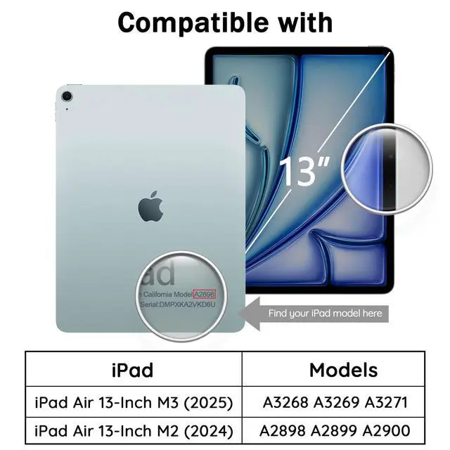 • CompatibilityThis iPad 13 inch is suitable with for iPad Air 13-inch (M3) 2025 (Model Number: A3268/A3269/A3271), iPad Air 13-inch Case (M2) 2024 (Model Number: A2898/A2899/A2900). Not compatible with any other iPad models. Check the bottom of the iPad to find the model number before purchasing.