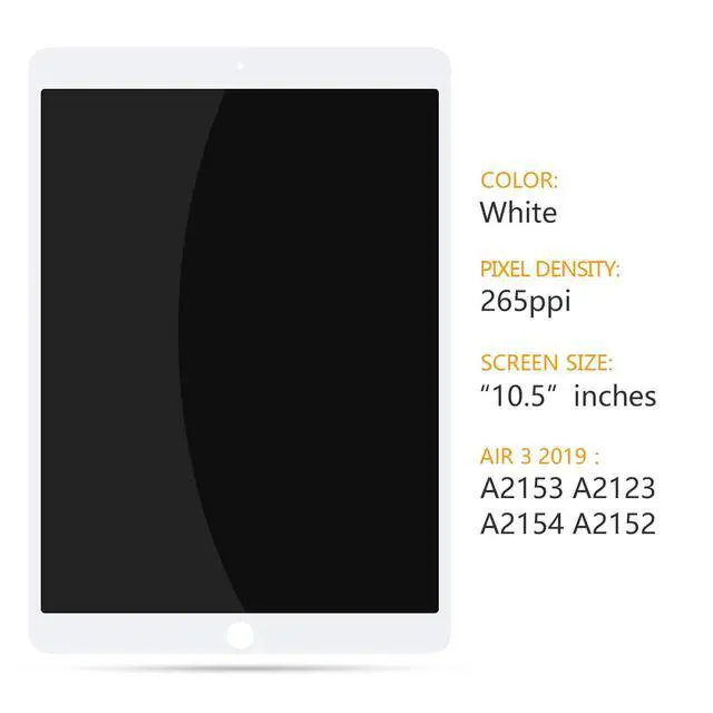 Our Goods is High Quality LCD Display Touch Screen Digitizer Assembly Glass Panel Replacement Kit For iPad Air 3 2019 3rd Gen A2152 A2123 A2153 A2154-Compatible with: For iPAD A2152 A2123 A2153 A2154 LCD Display Touch Screen Digitizer Assembly Kit-Size: 10.5 inchPackage Includes1x For iPad Air 3 3rd Generation 2019 LCD Display Touch Screen Digitizer Assembly Replacement1x Strong Suction Cup2x Triangle Opening Tools1x Card Pin1x Plastic Spudger1x Free TapeBefore Installation NotesTips 1: Test before installationWhen testing, do not remove any protective film or tags. Please pay attention to the problem of static electricity. Before attempting any repair, be sure to ground yourself is an ESD (electro static discharge) strap. This will prevent static electricity from damaging the electronic components within the phone. Ensure you wear eye protection and use caution not to cut your finger with the glass splinters.